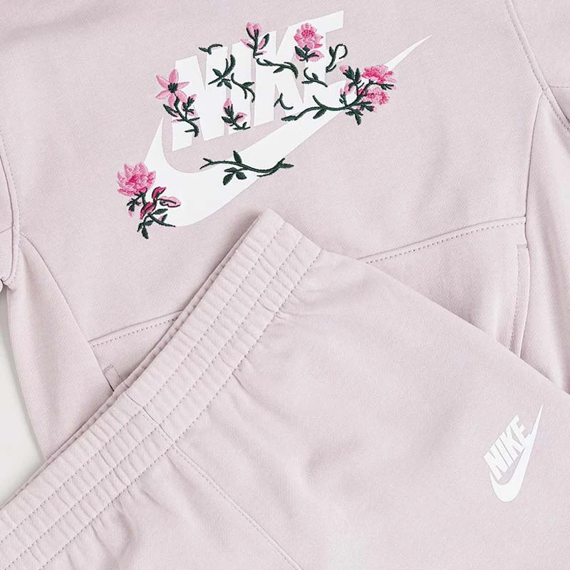 - Голяма щампа Nike с бродирани флорални мотиви на суичъра добавят стилна спортна атмосфера към цялата визия на модела.