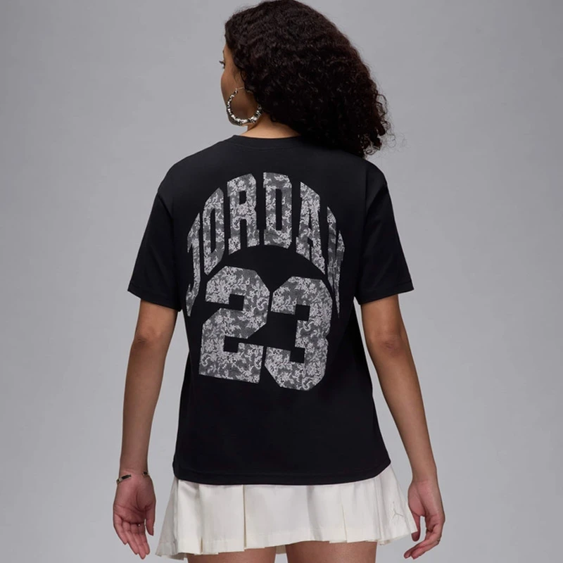 - Голяма щампа с имитираща дантела с емблематичния номер Jordan 23 на гърба.