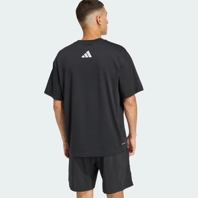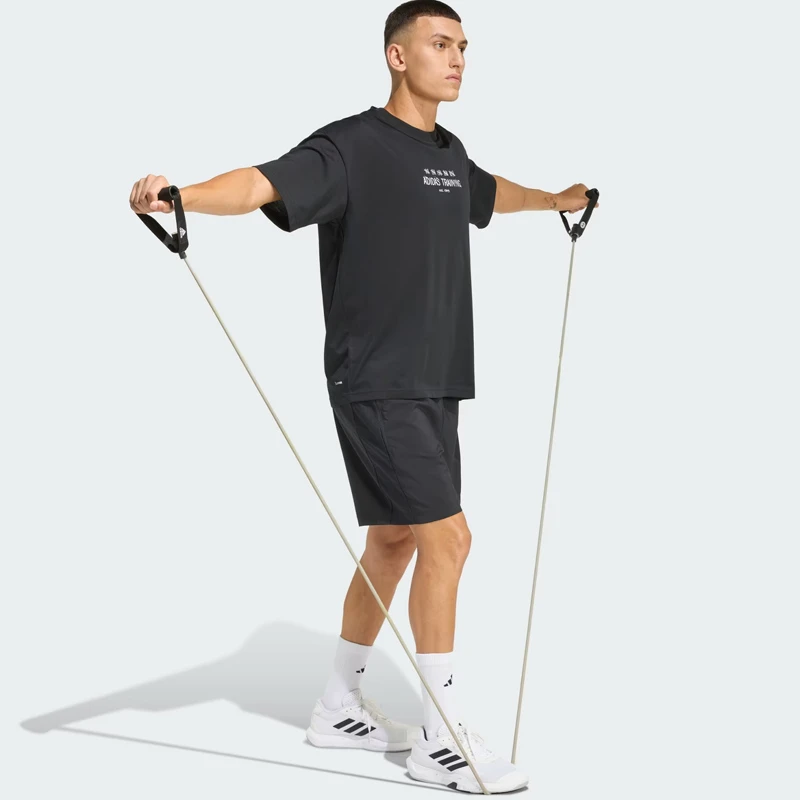 - Отличителните щампи на гърдите са вдъхновени от следите от тебешир, оставени по пода на фитнес залата от тренировки по вдигане на тежести. Направено в същия стил на гърба, лого с 3-Stripes допълва минималистичния дизайн.